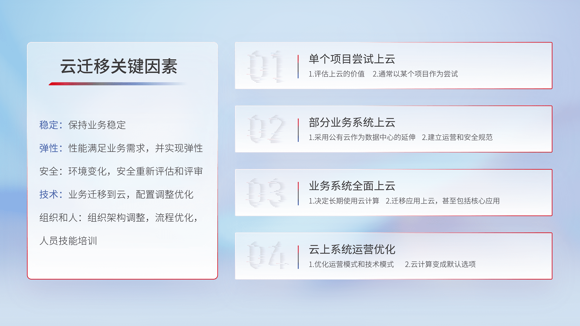 结合实际业务,,从规划设计、、、云平台选型、、云原生改造、、、数据迁移、、集成交付,,,迁移全过程为客户识别最佳上云路径,,,做好风险识别管理,,,,设计网络架构、、身份权限、、、、安全审计合规、、、操作审计、、日志审计、、监控告警策略、、、、多站点容灾设计等,,,,对云上基础设施进行整体规划,,提升IT治理水平,,,以满足弹性、、、高可用、、、、高性能的需求。。。。