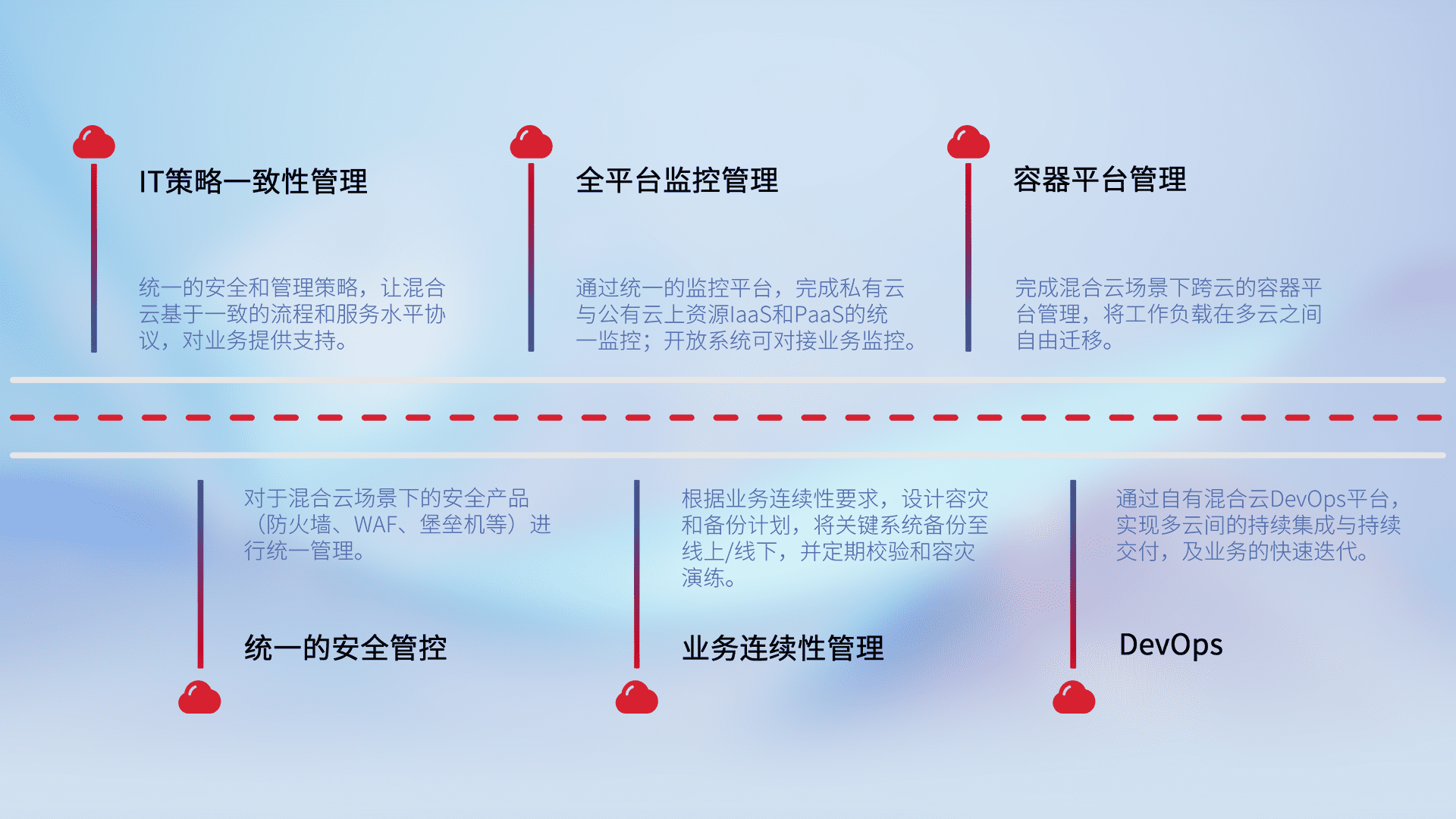 通过多云纳管,,以统一的资源数据模型把客户的云资源进行抽象和封装,,,,进而实现对多云资源的统一操作,,保障云资源管理的可靠性、、稳定性与可用性。。。。量身定制化运维内容,,,配置、、、、开发运维、、补丁管理、、、备份、、监控、、认证和访问管理、、审计和日常巡检等,,,,保障在用云过程中的可靠度,,稳定度以及高可用率。。。。