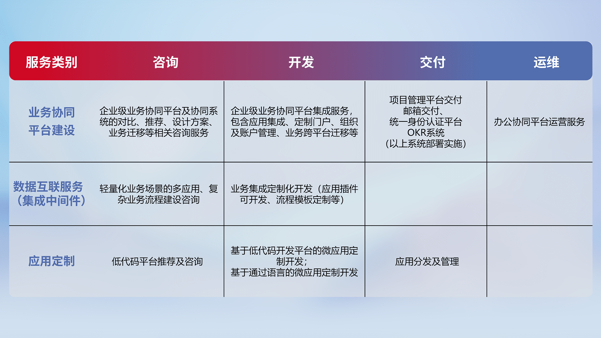 针对钉钉、、、企微、、、、IDaas等平台级产品提供产品的规划、、、、方案、、、、交付、、定制化开发等服务,,,实现如统一协同办公、、、智能客户服务、、、、混合会议管理、、智能数据查询、、等业务场景,,,,实现数字化转型。。